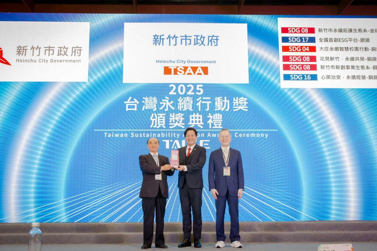 竹市永續發展及氣候變遷因應推動辦公室執行秘書林正光表示,今(114)年首度參與台灣永續行動獎,提出智慧科技優化庇護工場營運、全國首創ESG媒合平台、建構永續治安社區、推動永續智慧教室、發展永續觀光及新創動能辦公室等多項成果,獲得評審高度肯定,榮獲1金、1銀及4銅,共6項殊榮,同時邱代理市長獲頒台灣傑出永續治理首長獎地方組楷模獎,凸顯本市實踐宜居永續施政成效,也展現邱代理市長帶領市府團隊發揮相得益彰。