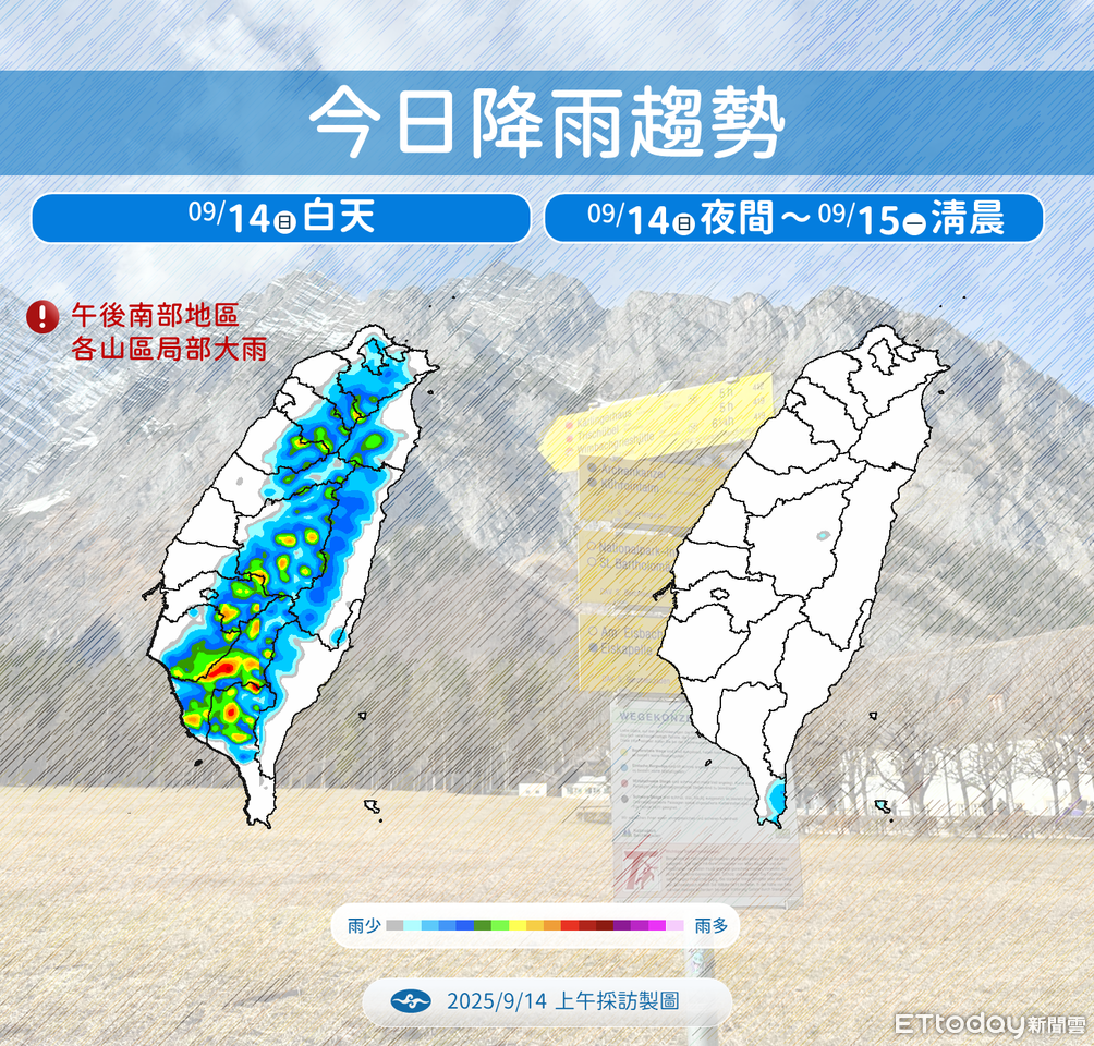 李名翔表示,今天受高壓影響,各地晴到多雲,台東及恆春半島有零星短暫陣雨,午後西半部地區及東半部山區有局部雷陣雨,南部地區及各地山區有局部大雨機率,晚間降雨趨緩,台東及恆春半島仍有零星陣雨。