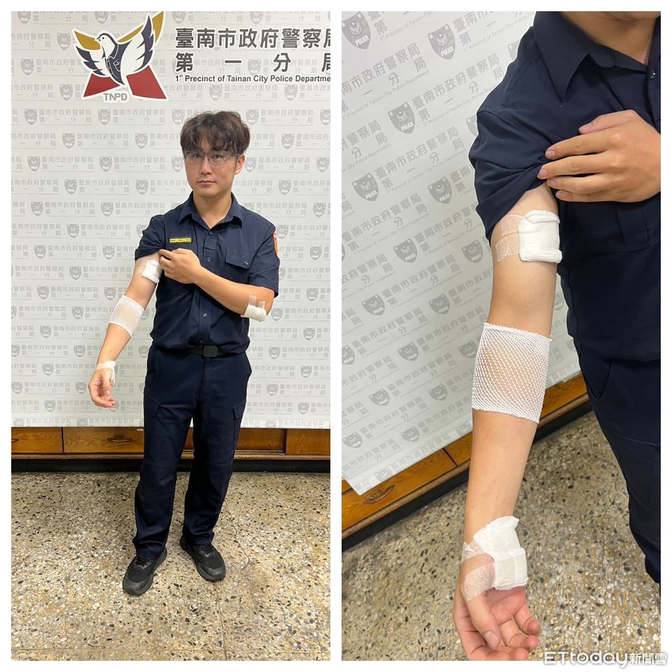 ▲台南市警一分局德高所長林海平在圍捕過程中右手臂被嫌犯咬傷,及身上挫傷,所幸送醫治療後無大礙。(圖/記者林東良翻攝,下同)