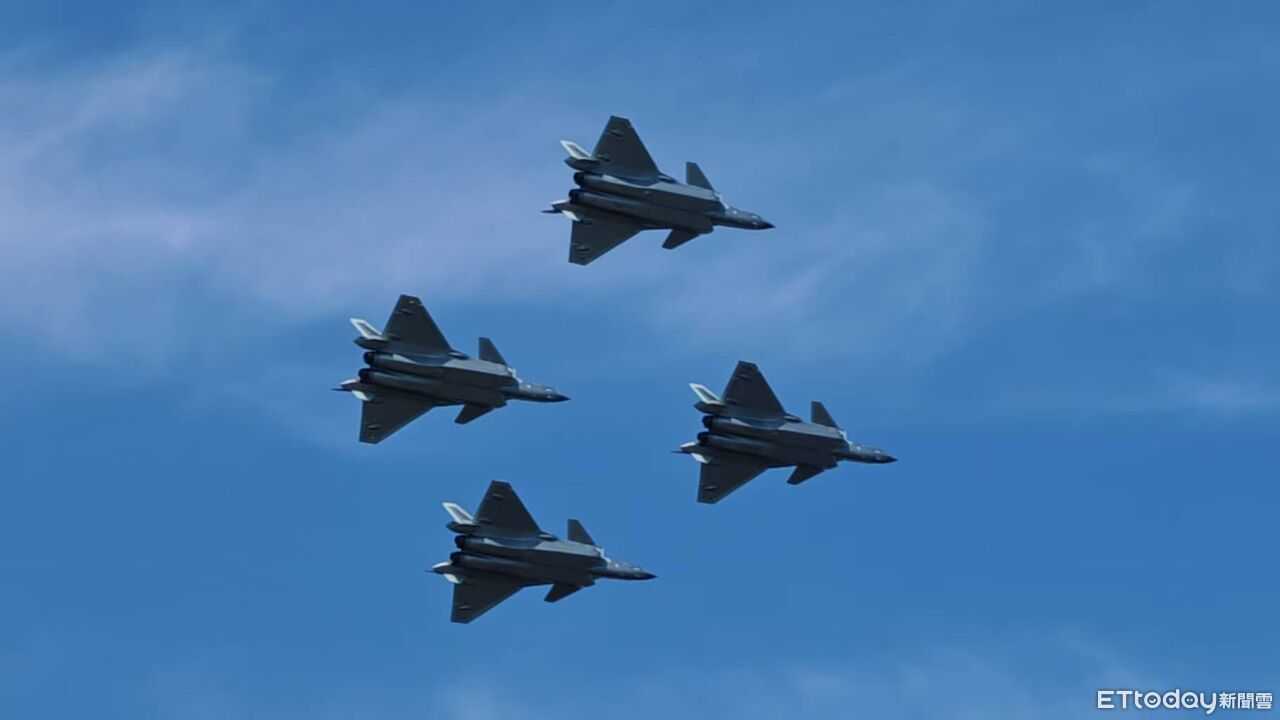 ▲ 四架殲-20戰機菱形隊形盤旋、空中對穿。(圖/記者任以芳攝)