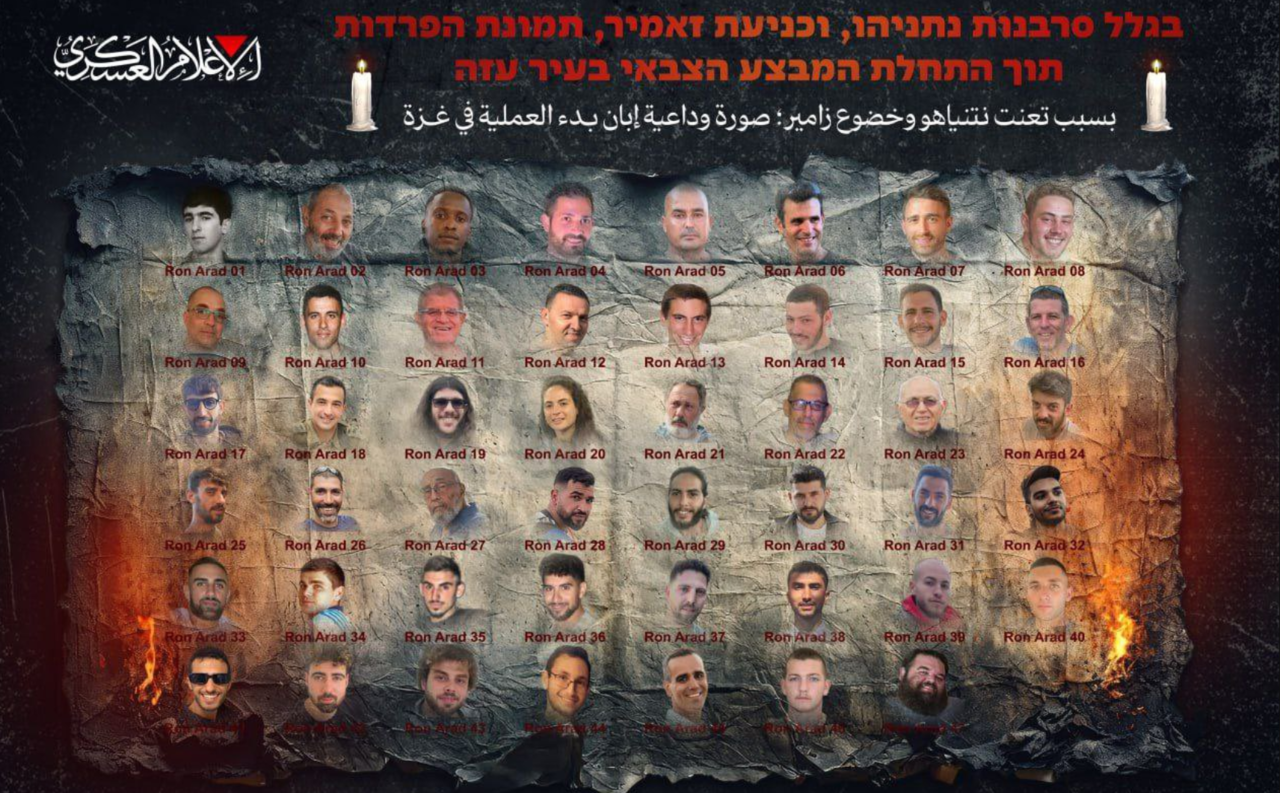哈瑪斯同日釋出一張宣傳圖,將48名人質照片全數打上「阿拉德」的名字,並附上文字指責以色列總理納坦雅胡(Benjamin Netanyahu)與參謀總長薩米爾(Eyal Zamir),稱軍事行動展開後,人質下場恐成告別影像。