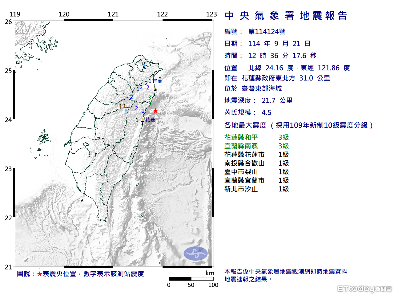 各地震度級:花蓮縣、宜蘭縣最大震度有3級、南投縣、台中市及新北市地區最大震度1級。