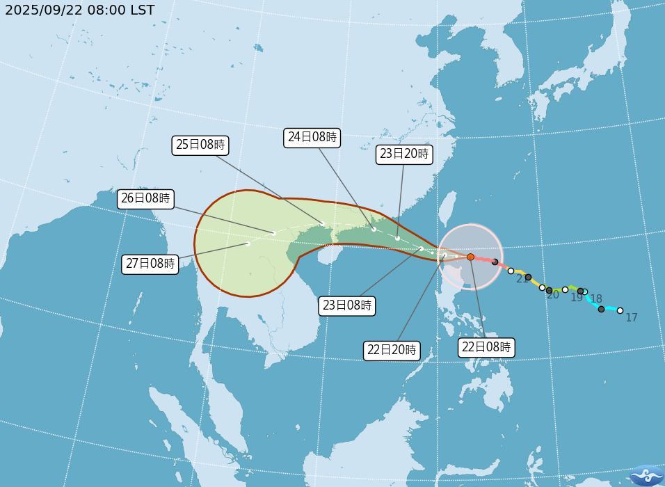 氣象署表示,樺加沙颱風結構完整、暴風圈範圍廣,未來還有增強空間,預計今晚到達南端海面,明天清晨至上午到達西南風海面,今天下半天到明天上半天最接近台灣。
