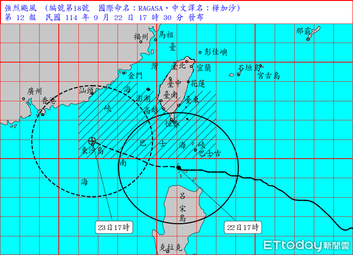 氣象署也說,今天屏東縣局部地區有平均風12級以上或陣風14級以上發生的機率,今、明天蘭嶼、綠島、澎湖縣、屏東縣局部地區有平均風9級以上或陣風11級以上發生的機率。