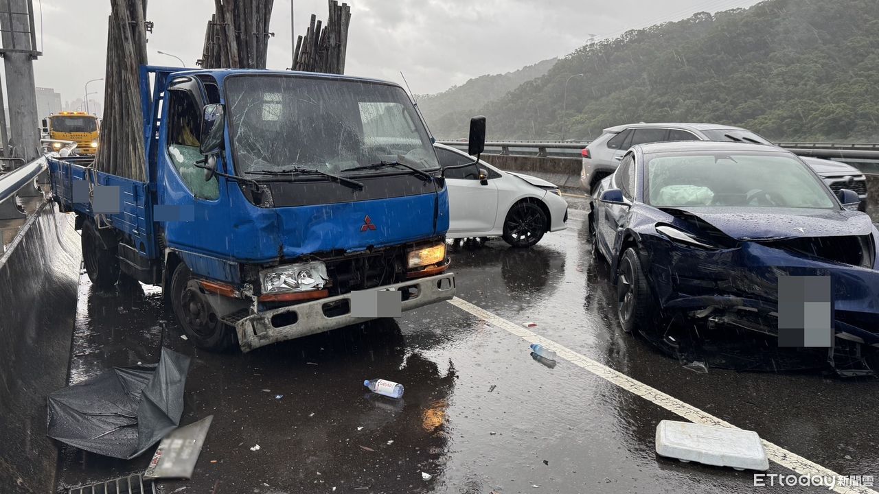 今天上午6時許,王男駕駛特斯拉疑因天雨路滑操作不當自撞護欄,車輛停在外側車道等待拖吊救援,後方顧姓男子駕駛小客車未注意車前狀況,直接追撞王男車輛,約1分鐘後,黃男駕駛小貨車追尾推撞顧男及王男車輛。