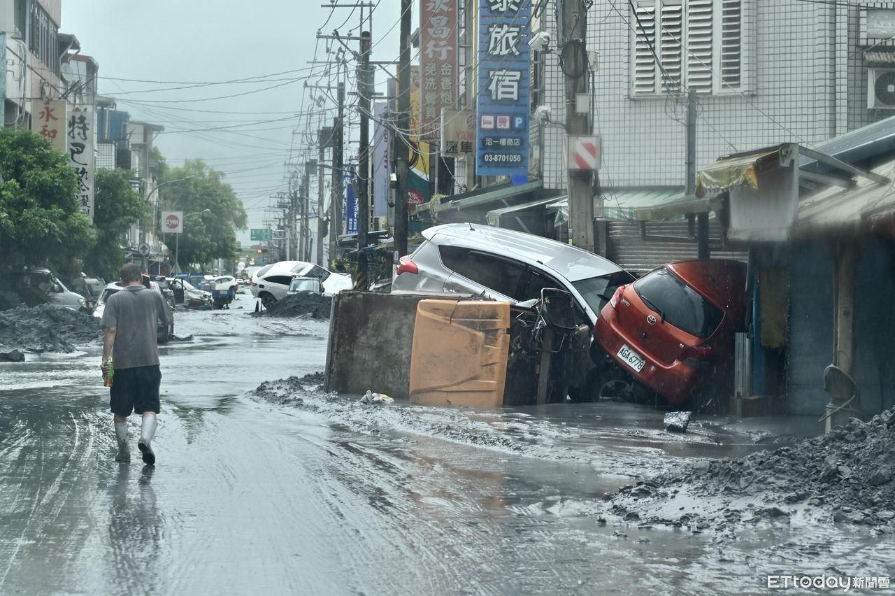 ▲強颱「樺加沙」雖逐漸遠離台灣,但外圍環流持續影響全台,花蓮縣馬太鞍溪上游堰塞湖溢流,洪峰沖毀馬太鞍溪橋,大水漫入光復鄉市區,市區街頭一片狼藉,滿是污泥 。(圖/記者李毓康攝)