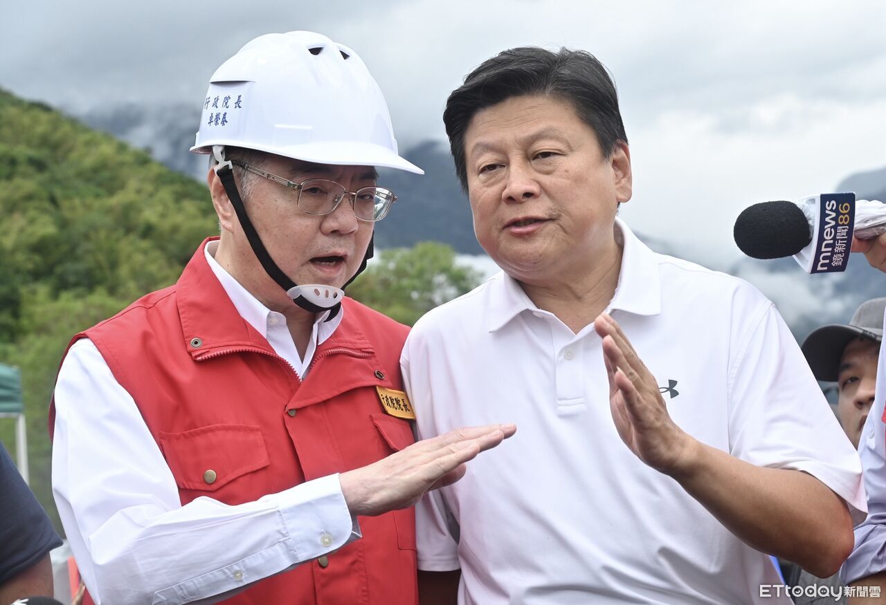▲花蓮縣馬太鞍溪上游堰塞湖溢流,洪峰沖毀馬太鞍溪橋,大水漫入光復鄉市區,行政院長卓榮泰與傅崐萁到馬太鞍溪斷橋邊視察 。(圖/記者李毓康攝)