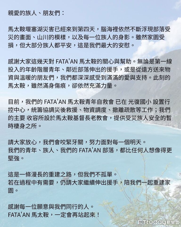 FATA'AN馬太鞍部落會議26日在社群PO文發表一封公開信,針對連日為馬太鞍部落受災救援及各界物資援助表達衷心的感謝,PO文發出引起網內族人熱烈回應。