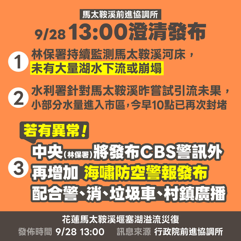 花蓮馬太鞍溪堰塞湖溢流重創光復鄉,各界捐物資、當志工一起協助災區重建。今(28)日近午佛祖街再度傳潰堤消息,在現場的民眾、志工、媒體緊急撤離。對此,行政院前進協調所澄清,強調農業部林保署持續監測馬太鞍溪河床,目前未有大量湖水下流或崩塌情形。