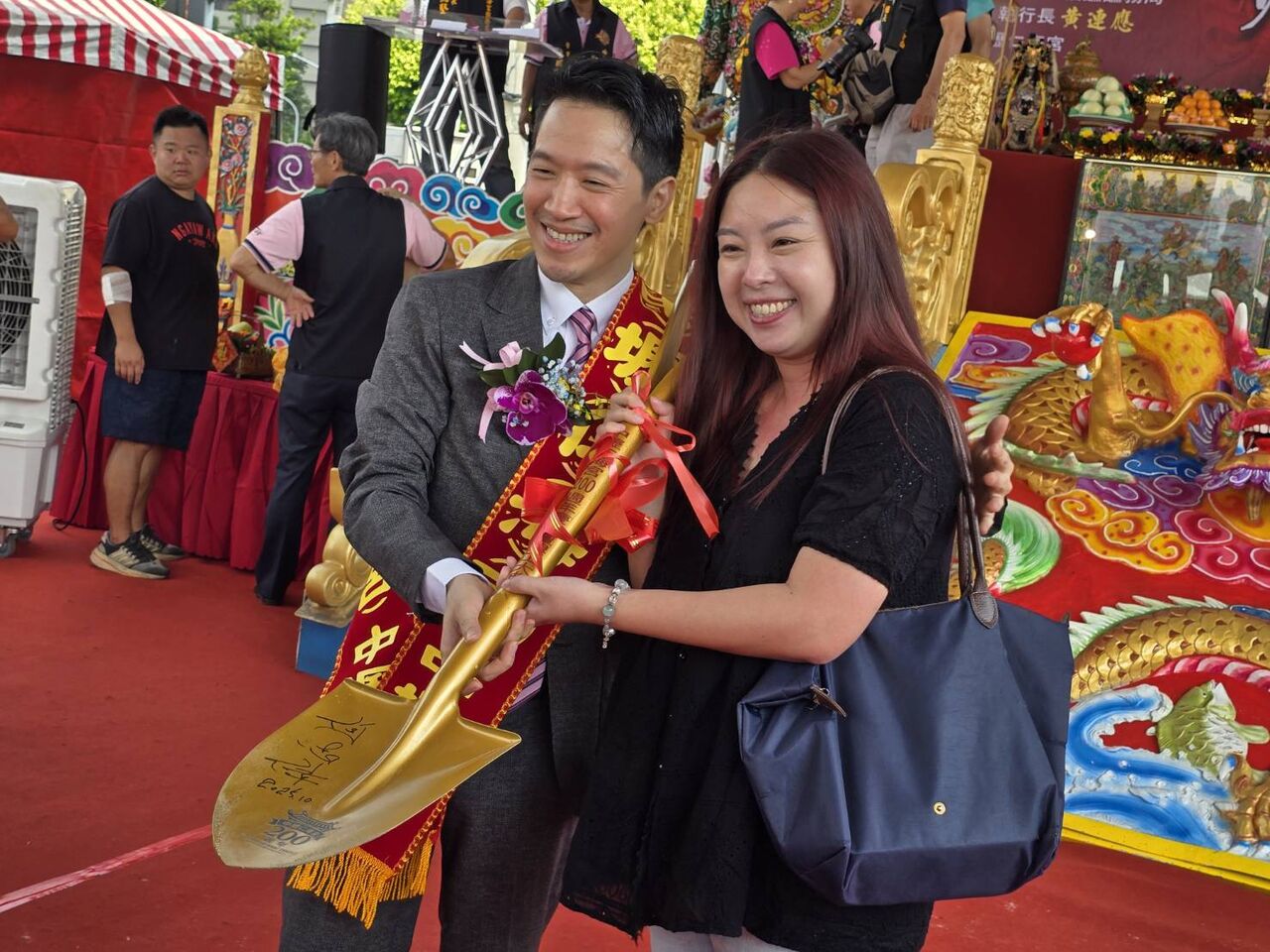 ▲動土典禮現場,何志偉(左)應信眾請求,將象徵「好孕」的金鏟子贈予求子民眾,場面溫馨感人。