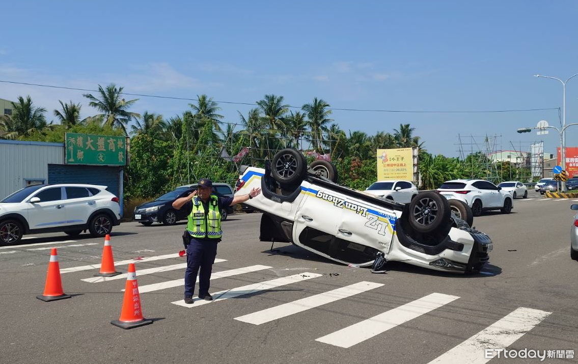 ▲▼今早橋頭區發生嚴重交通事故,一輛大貨車在路口迴轉時,與直行的皮卡發生碰撞,導致強大撞擊力讓汽車當場四輪朝天。(圖/記者吳世龍翻攝)