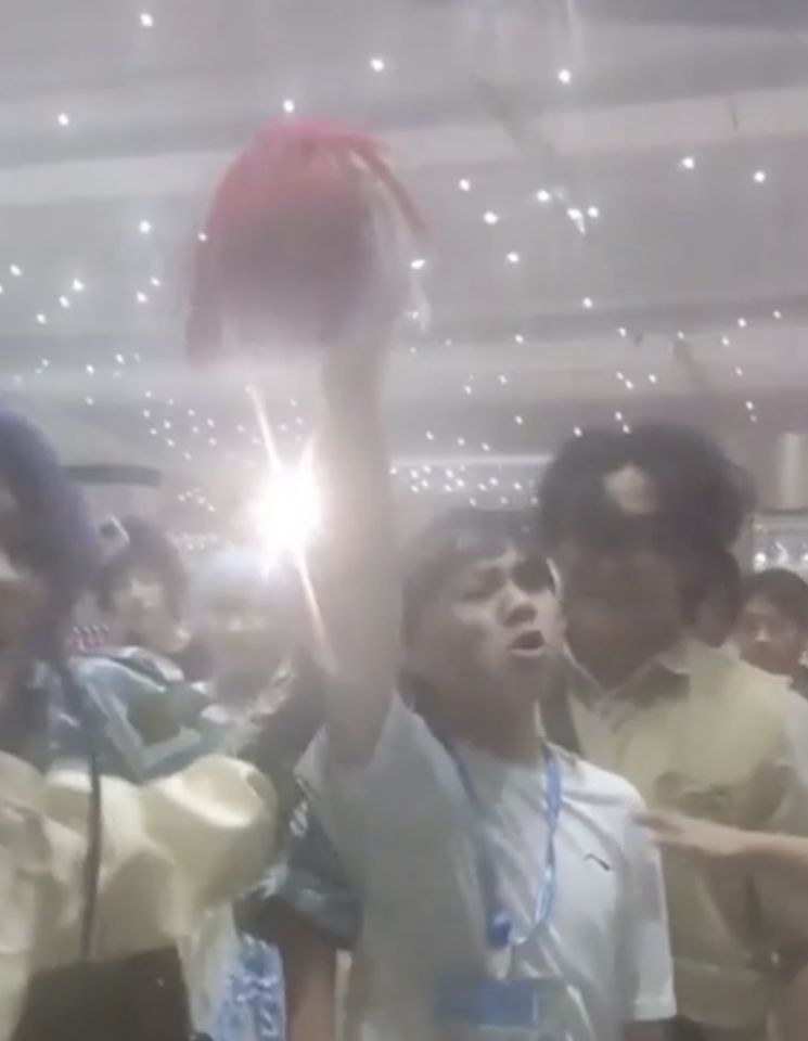 ▼男子搶走「轟焦凍」的假髮,接受人群歡呼。(圖/翻攝微博)