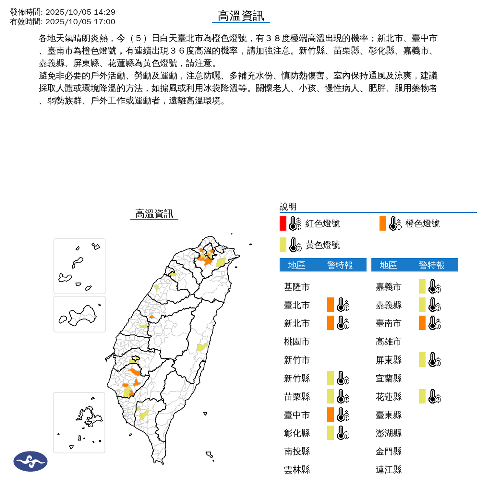 中央氣象署針對11縣市發布高溫警示,其中因各地天氣晴朗炎熱,今(5)日白天台北市為橙色燈號,有38度極端高溫出現的機率;新北市、台中市、台南市為橙色燈號,有連續出現36度高溫的機率;新竹縣、苗栗縣、彰化縣、嘉義市、嘉義縣、屏東縣、花蓮縣為黃色燈號,請注意。