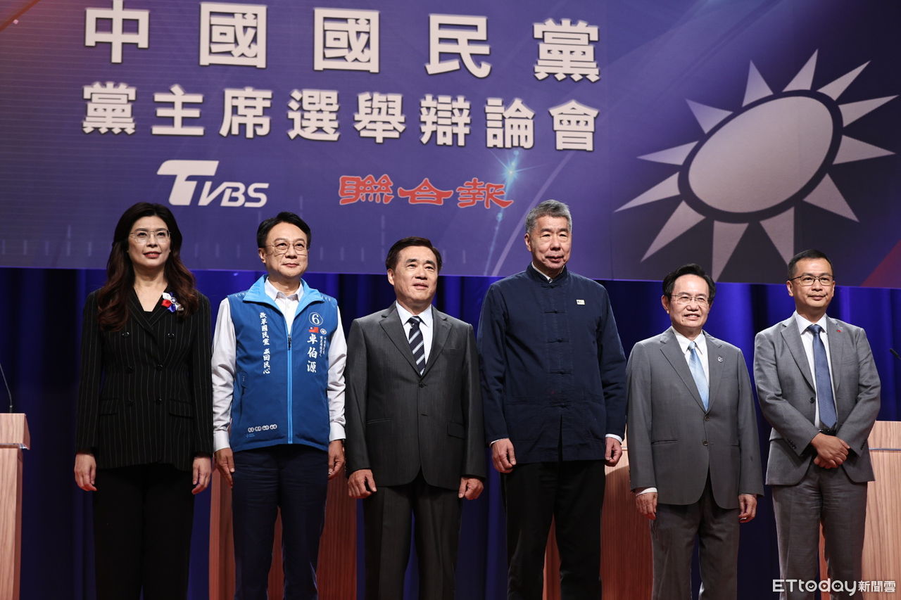 ▲國民黨主席候選人鄭麗文(左起)、 卓伯源、郝龍斌、張亞中、蔡志弘、羅智強日前出席電視辯論會。(圖/記者林敬旻攝)