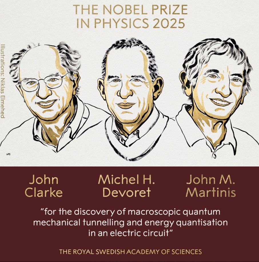 2025年諾貝爾物理學獎剛剛揭曉,得主為3名在美國加州大學任教的學者,分別為克拉克(John Clarke)、馬蒂尼斯(John M. Martinis)與德沃雷(Michel H. Devoret),他們因為「發現了電路中的宏觀量子穿隧和能量量子化」獲此殊榮。