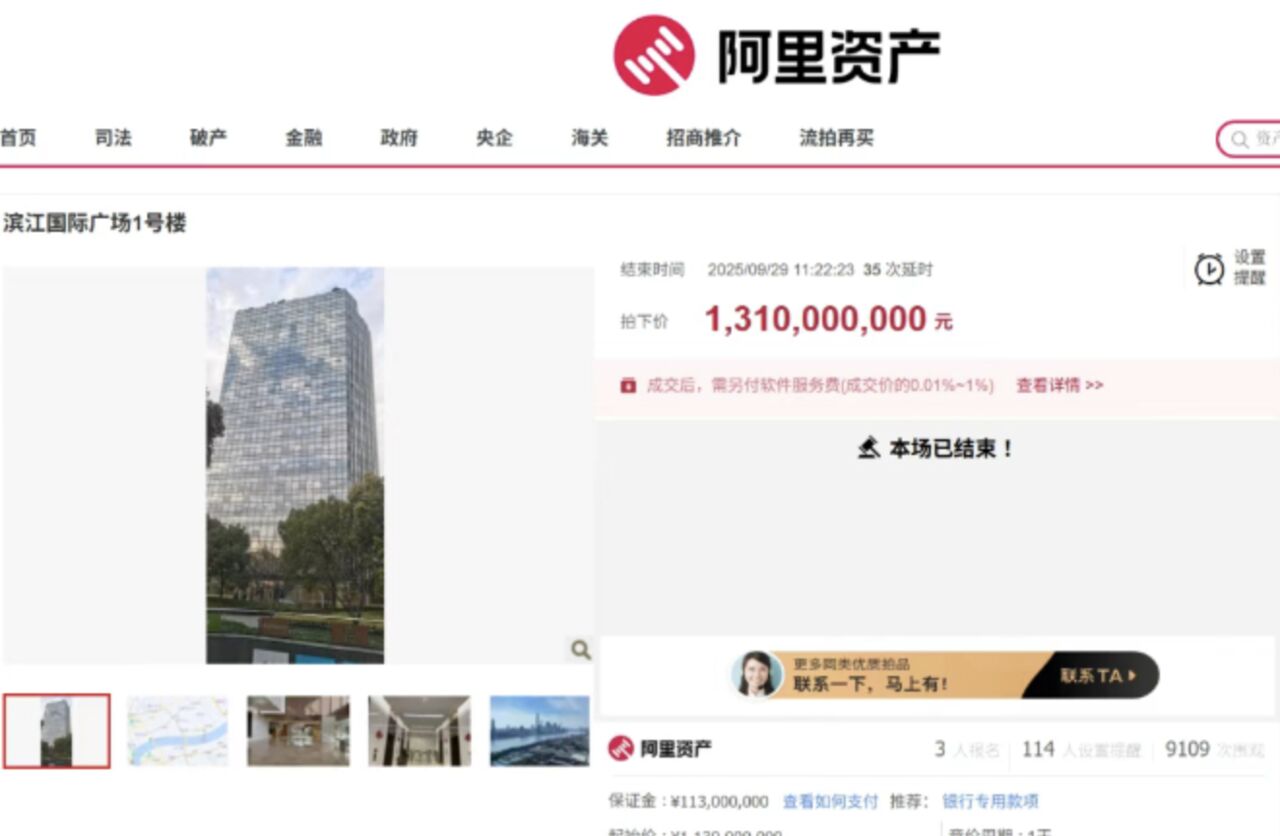 《每日經濟新聞》報導,據阿里資產拍賣平台,近日,陽光城總部濱江國際廣場1號樓拍賣成交。本次拍賣起始價為11.3億元,此次拍賣經過37輪競拍,最終成交價格為13.1億元。