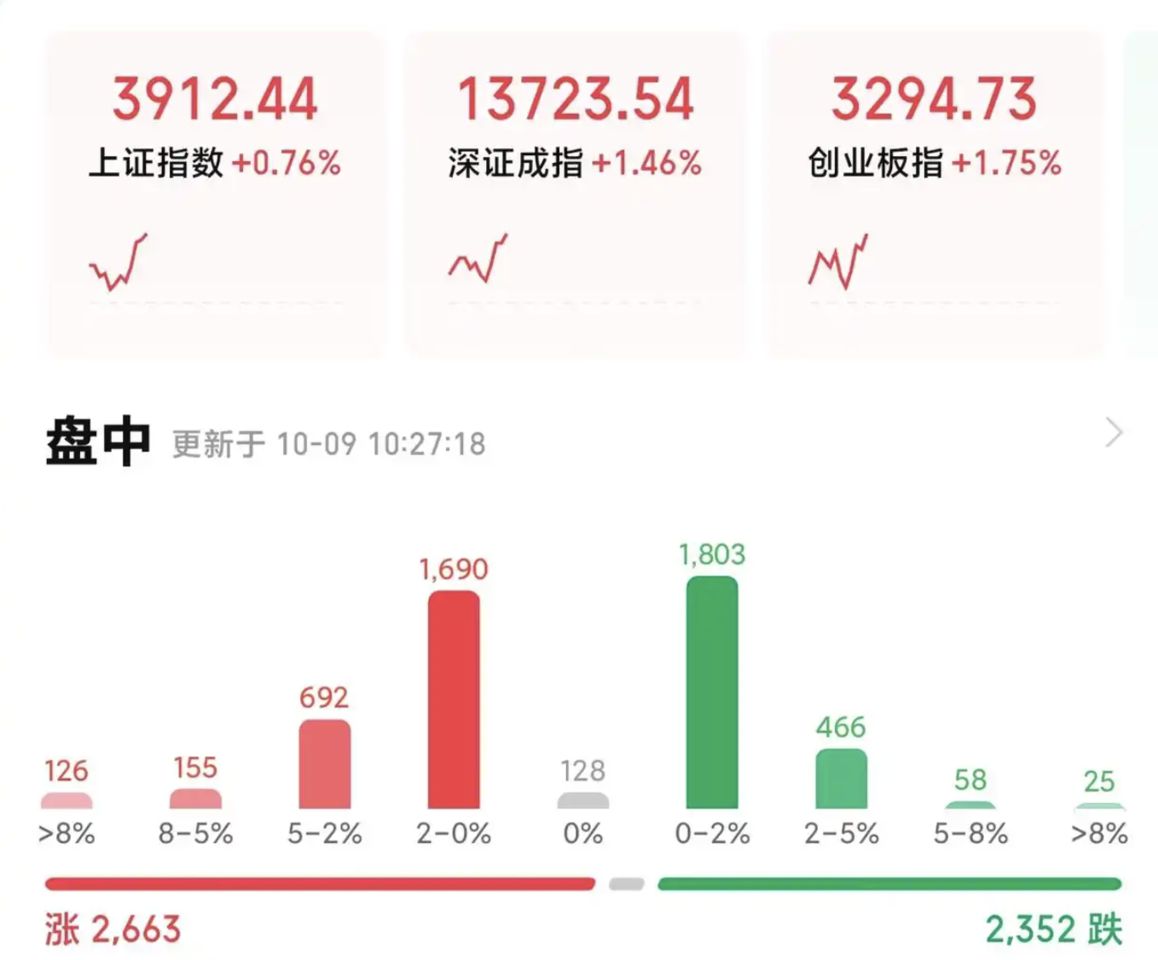 大陸A股10月9日早盤主要指數大漲,上證指數突破3900點整數關口,這是2015年8月以來的首次,科創50指數大漲逾5%。此外,三大指數集體高開,滬指漲0.4%,深指漲0.53%,創業板指漲0.4%。隨後,指數震盪拉升。截至發稿,三大指數漲幅分別為0.76%、1.46%、1.75%。