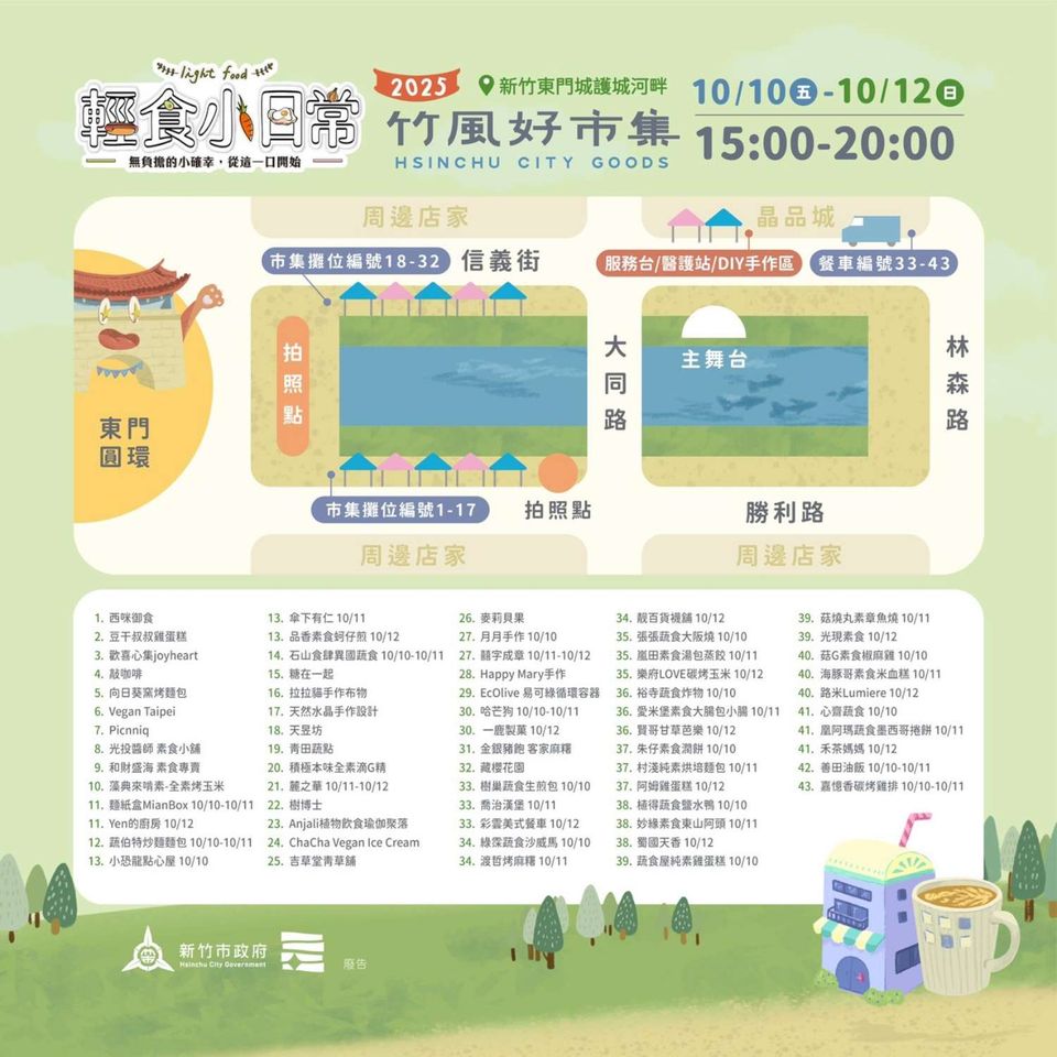 隨著國慶雙十連假即將到來,新竹市「2025竹風好市集」將於10月10日至12日推出第四週主題「輕食小日常」,邀請市民與旅客漫步護城河畔,品嚐健康蔬食與簡單美味,在輕鬆氛圍中體驗「健康也能很好吃」的生活風潮。