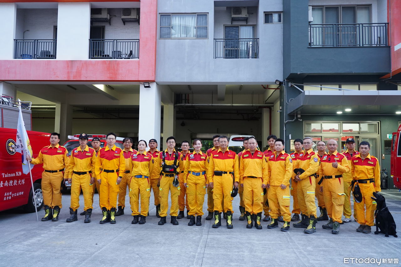 ▲台南市特搜隊拂曉整裝出發花蓮災區,攜帶搜救犬NINA與重型裝備投入救援。(記者林東良翻攝,下同)