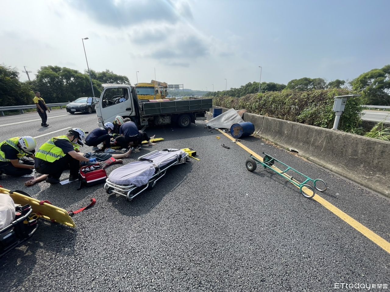 ▲小貨車自撞護欄後,車上2人疑似遭彈出車外。(圖/記者白珈陽翻攝)