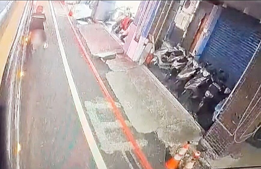 ▲桃園市黃姓男子昨晚騎車上班途中醉醺醺撞上公車,圖為監視器畫面。(圖/桃園警方提供)