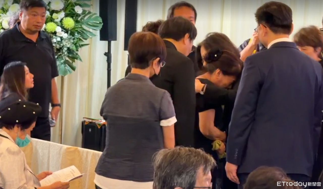 ▲前總統蔡英文致意時,遺孀朱阿英痛哭,蔡英文擁抱安慰。(圖/翻攝直播)