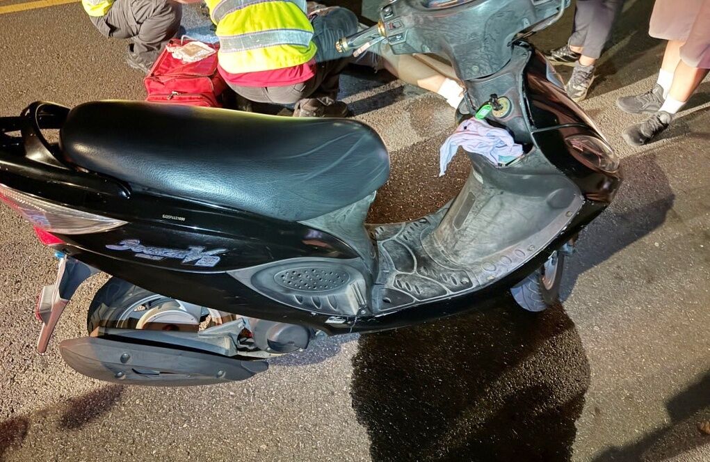 ▲桃園市劉姓騎士9日深夜騎車行過龜山區光榮路時,路旁一隻小狗突然衝出,劉姓騎士緊急煞車導致人車倒地,龜山警消據報到場處理。(圖/龜山警方提供)