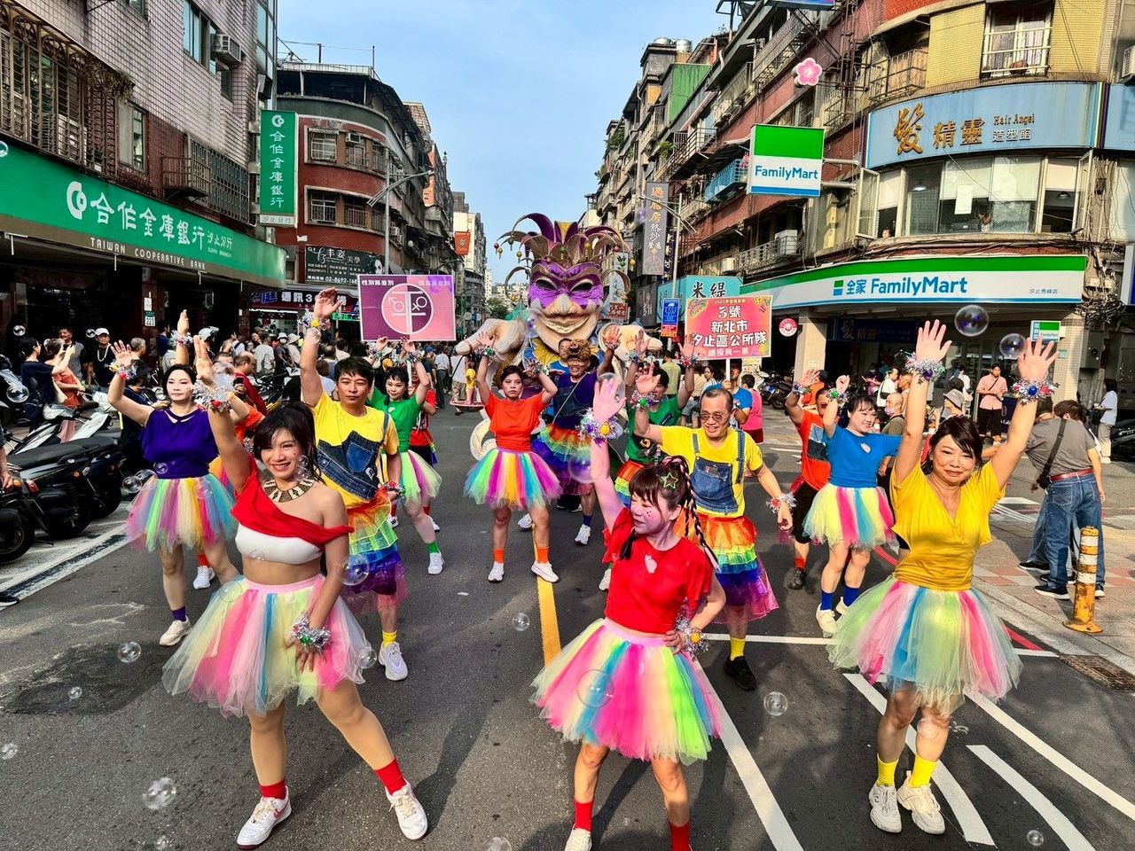 今年不僅有穿著繽紛華麗的森巴女郎,高達6公尺的巨型花車,更是吸睛焦點,兩手各持一端的天平,代表性別間的平等與平衡,彩虹元素交織,象徵多元性別及尊重差異,每一種顏色都有著獨特的價值。其中最引人注目的是「汐止區公所隊」,特別以象徵多元性別的六色彩虹為設計主題,藉由活潑豐富的配色,男性也可以穿裙子的打扮,展現性別平等的理念。