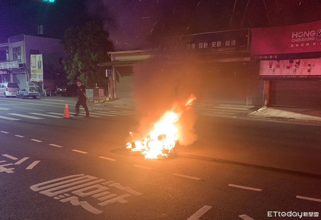 ▲台南市安南區海佃路二段凌晨發生機車自摔起火,消防人員迅速撲滅火勢。(記者林東良翻攝,下同)