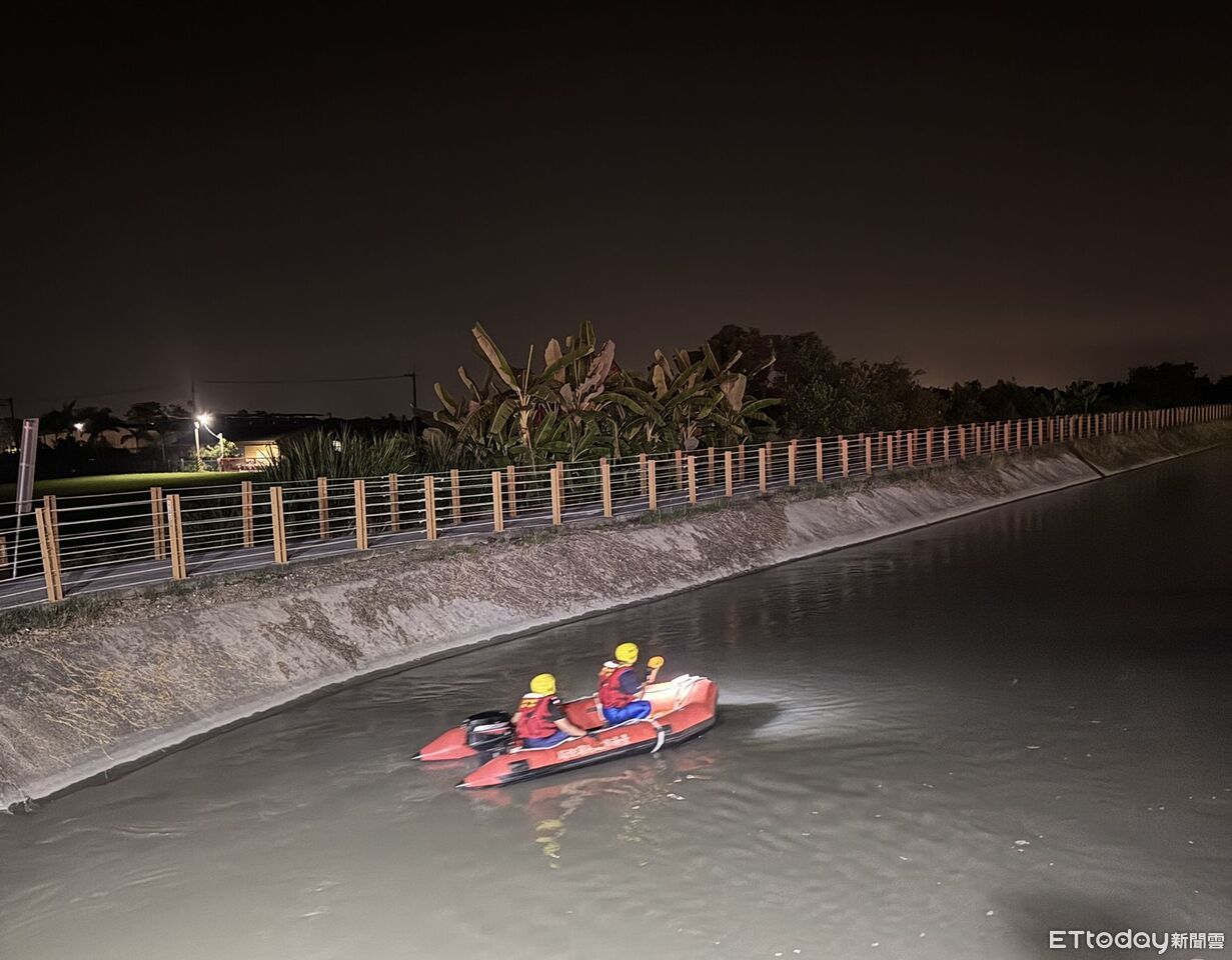 ▲台南柳營嘉南大圳傳出疑似落水事件,警消出動橡皮艇與無人機進行夜間搜尋。(記者林東良翻攝,下同)