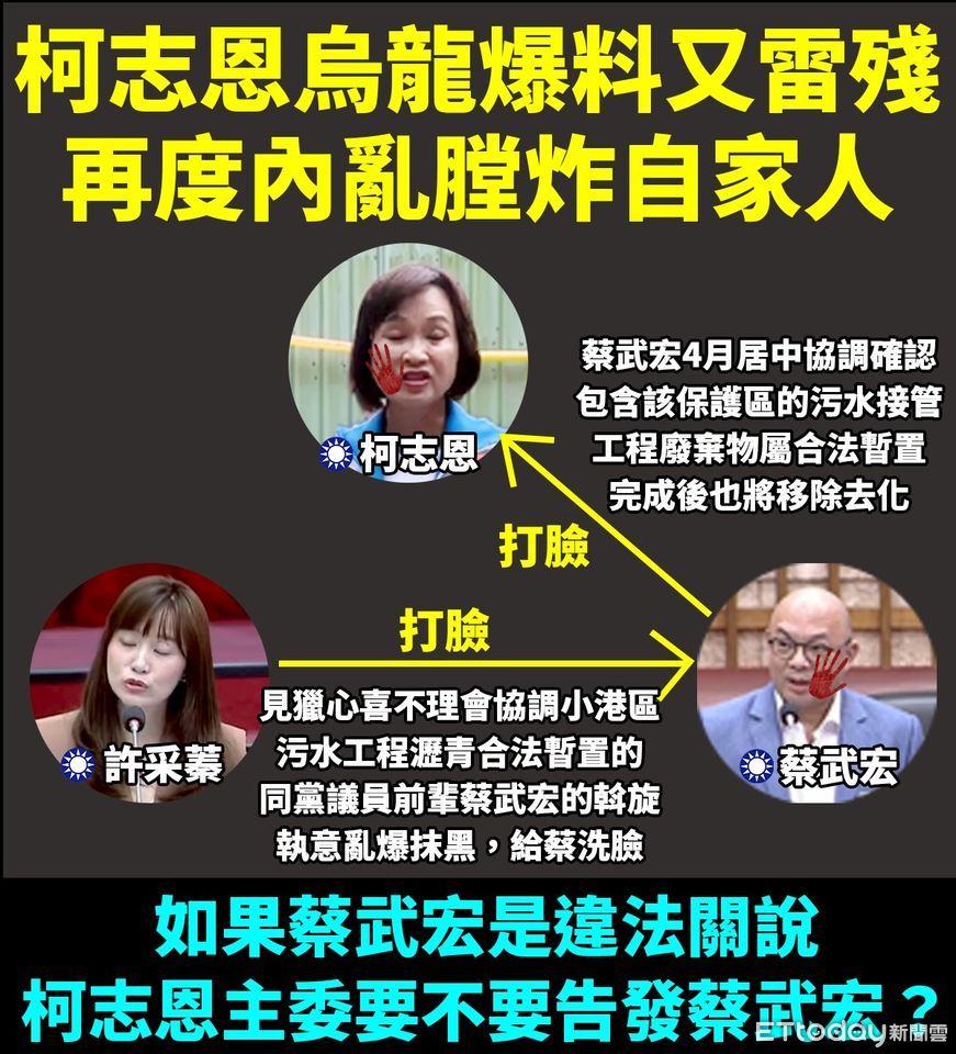 黃彥毓還原,國民黨蔡武宏多次斡旋協助廠商合法暫置,結果同黨的許采蓁利用質詢時間誣指,後遭市府水利局出面打臉。沒想到同黨高雄市長參選人柯志恩今(13)日還要帶著黨籍立委陳菁徽,浩浩蕩蕩的前往大坪頂暫置場演出個人秀,殊不知搞錯法令、罔顧事實就算了,還將自家議員蔡武宏拖下水。