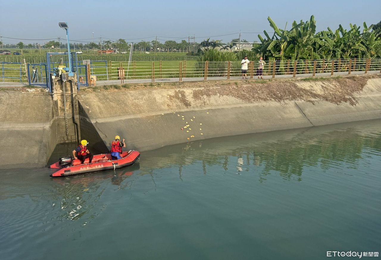 ▲消防人員13日下午在東山區木柵橋嘉南大圳下游發現落水的周姓男子遺體。(記者林東良翻攝)