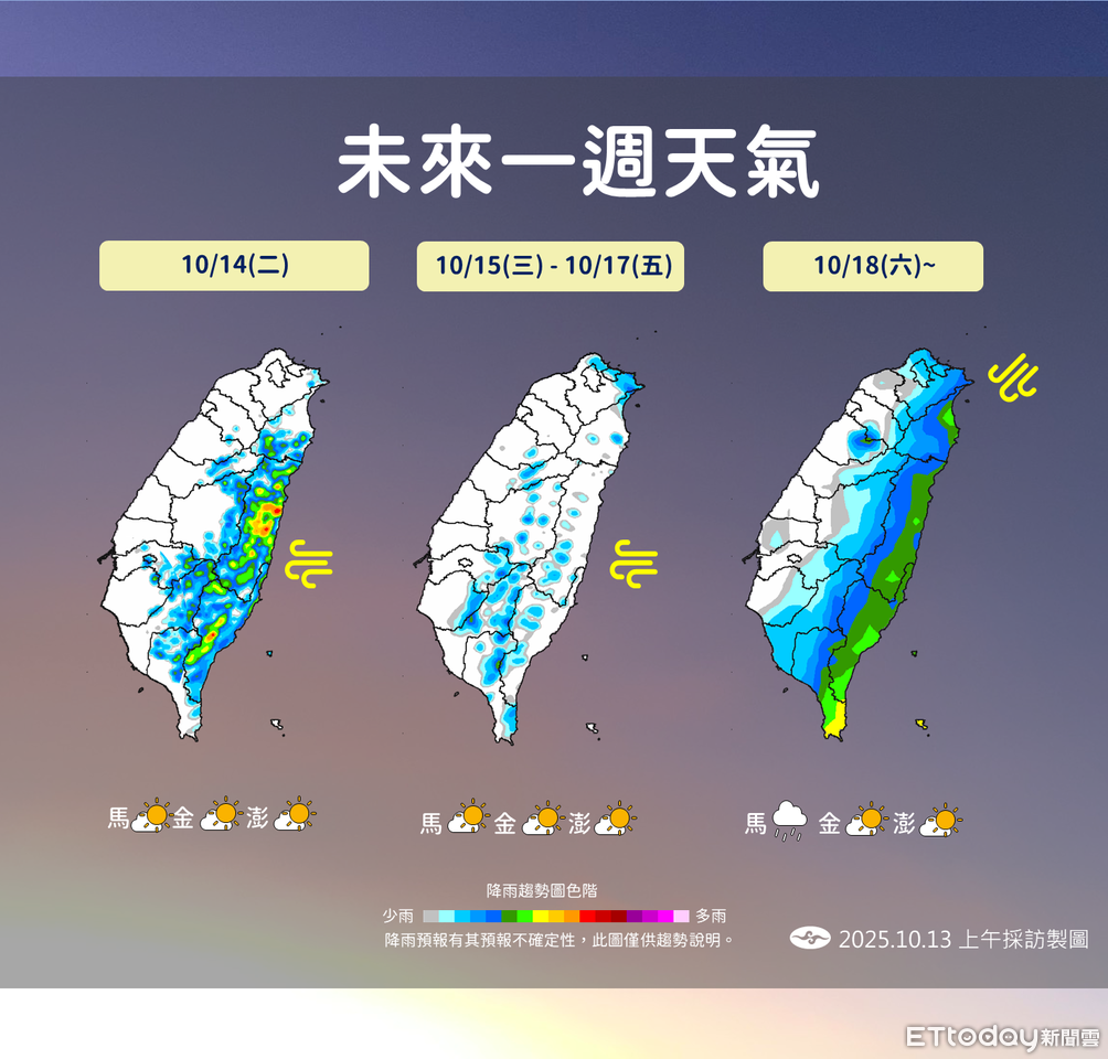 劉沛滕指出,周六東北風帶來水氣,基隆北海岸、大台北山區、宜蘭及東半部有局部降雨。下周日東北季風,加上熱帶性低氣壓或颱風影響,降雨廣泛,桃園以北、東半部有短暫降雨,新竹及苗栗也有局部降雨。下周一東北季風及熱帶系統外圍環流影響,中南部地區也有局部雨勢。