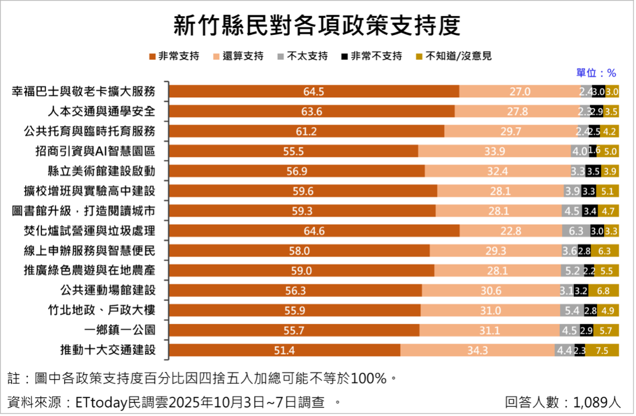 在新竹縣政府四大施政主軸下所推動的14項政策中,縣民最支持的前五項政策依支持度排名分別為:「幸福巴士與敬老卡擴大服務」支持度達91.5%、「人本交通與通學安全」91.4%、「公共托育與臨時托育服務」90.9%、「招商引資與AI智慧園區」89.4%,以及「縣立美術館建設啟動」89.3%。