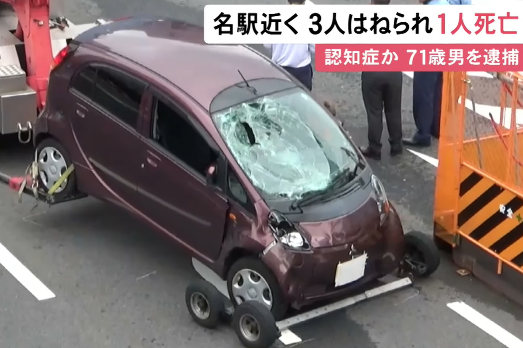 日本名古屋車站附近發生重大車禍,一名71歲男子駕駛輕型車,在十字路口撞上3名正在過馬路的行人,造成1死2傷的悲劇。據當地警方調查,肇事駕駛疑似患有失智症,事發時車輛逆向行駛且無視交通號誌。