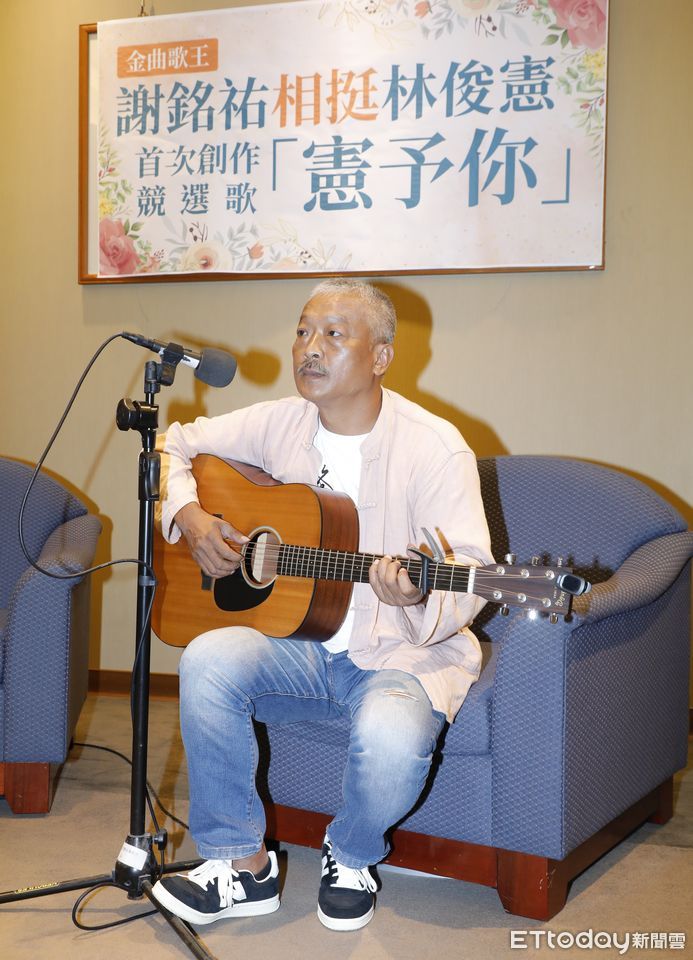 ▲民進黨立委林俊憲舉辦「競選歌曲發表記者會」,邀請台南金曲歌王謝銘祐為其創作並親自演唱全新競選歌曲《憲予你》。(圖/記者湯興漢攝,下同)