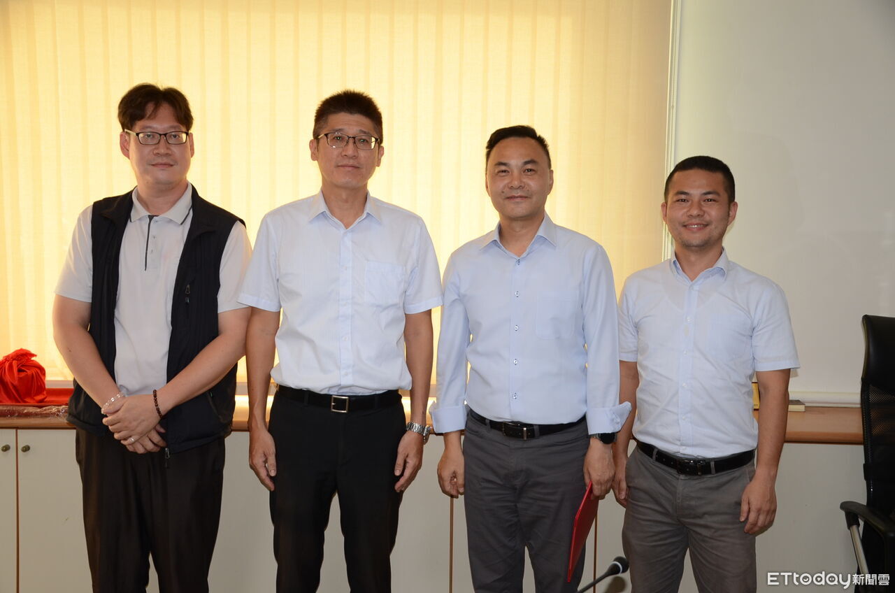 ▲台南市政府交通局長王銘德(右二)佈達新任停車工程科長孫允昌(左一)、新任公共運輸處長劉佳峰(左二)、新任交通管制科長劉昆和(右一)等人事案。(記者林東良翻攝)