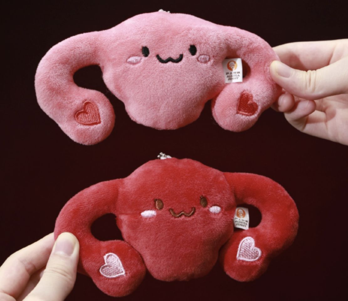 《極目新聞》報導,滬上阿姨茶飲品牌推出一款雙杯飲品套餐,內含一個子宮造型的玩偶。該玩偶命名為「小宮舉毛絨玩偶」,從外形看,與子宮相似,倒梨形,還有「輸卵管」和「卵巢」。分為粉色和紅色兩款,頁面介紹中寫道,兩種顏色是對應每個月的不同時期。