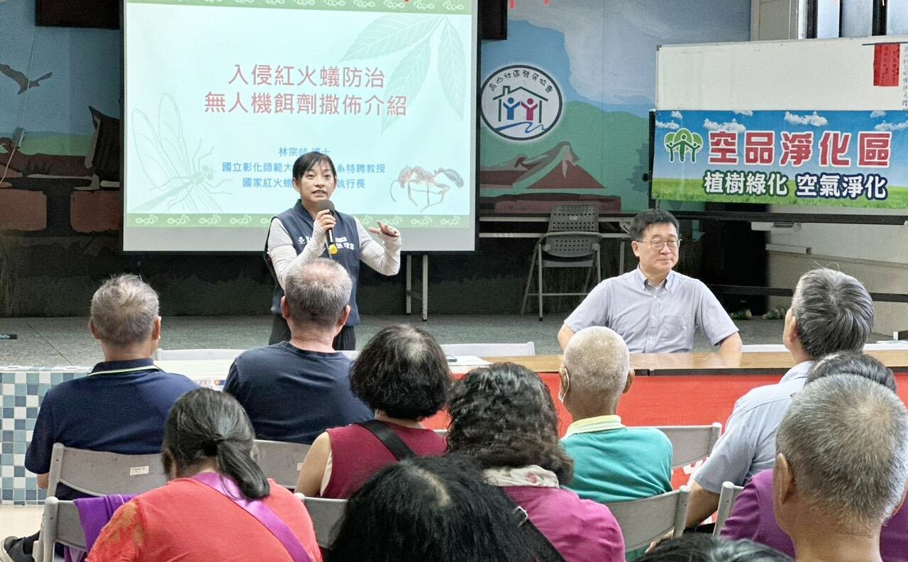 桃園市政府農業局、國家紅火蟻防治中心與楊梅區公所,今(17)日在楊梅區高山里市民活動中心舉辦「無人機撒佈入侵紅火蟻防治餌劑示範觀摩會」,農業局局長陳冠義指出,透過智慧科技創新防治作為,可望有效減少區域紅火蟻族群數,更降低農民被紅火蟻螫咬受傷機率。