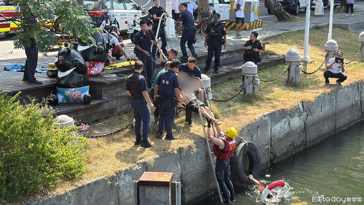 警消獲報趕抵現場,利用雙節梯及繩索,順利將落水男子救起。經救護人員初步檢視,該男子仍有生命徵象,立即送醫急救。