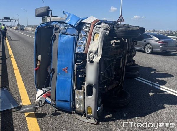 ▲70歲吳男駕自小貨車,自撞內側護欄,翻覆國道1號五楊高架。(圖/國道警方提供)