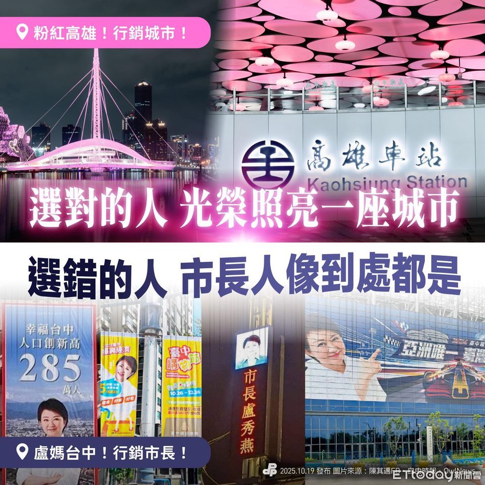 南韓女子天團BLACKPINK周末2天18、19日在高雄世運開唱,整座港都染上粉色迎接4位天后,除了海洋流行音樂中心等六大知名地標與各主要飯店、百貨以粉紅色燈飾應援外,在世運主場館、中央公園、駁二藝術特區等三大地點,更設置5座「BLIИK主題號誌燈」,讓整座城市閃耀BLACKPINK的粉紅魅力。對此,民進黨今(19日)以台中市充滿台中市長盧秀燕人像的行銷模式對比,「選對的人,光榮照亮整個高雄;選錯的人,市長充滿整個台中」。