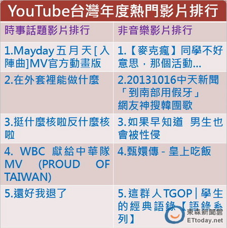 Google談到,由於現在有很多網友和素人,都會以懶人包方式,或者製作反諷影片上傳YouTube,以至於今年社會議題增多,像反核、洪仲丘案的相關歌曲,甚至馬王政爭街訪都紛紛躍上前十名。