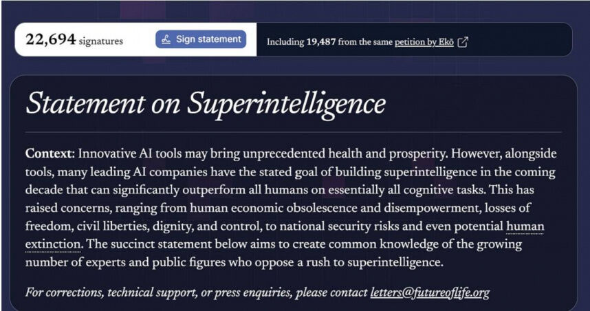 人工智慧(AI)技術以驚人速度發展之際,全球逾850位科技領袖與專家聯署發表《關於超智能的聲明》(Statement on Superintelligence),呼籲暫停開發可能全面超越人類認知能力的「超智能」(Superintelligence)。