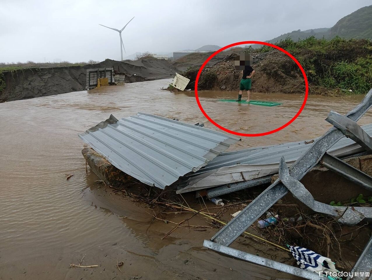▲郵務車不小心開進河道滅頂,郵差爬車頂獲救。(圖/記者陳以昇翻攝)