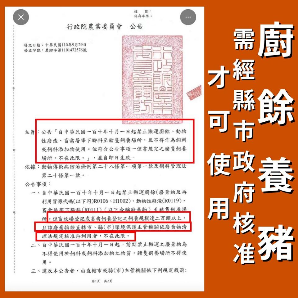台中傳出全台首例非洲豬瘟疫情,引發產業震撼。藍營側翼稱,原因是總統賴清德過去就任行政院長時開放「廚餘養豬」。事實上當時政府規範,廚餘若要拿來養豬,必須「加熱九十度以上、連續蒸煮一個小時」,到了2021年更進一步全面禁止廚餘養豬。對此,綠委陳培瑜今(23日)秀公文表示,2021年,中央政府就公告禁止廚餘養豬,除非同時符合兩個但書:200頭以上,並且經由縣市政府核准再利用,才可以用廚餘養豬,是「縣市政府」自己決定禁止或使用,雲林縣禁止,台中市開放。