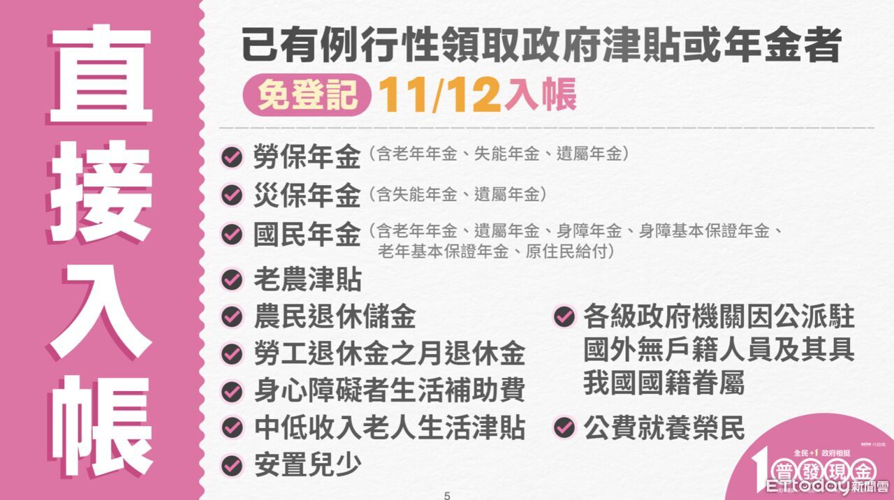 而針對已領有例行性政府津貼或年金者推出的「直接入帳」,包含勞保年金、災保年金、國民年金(含原住民給付)、老農津貼、農民退休儲金、勞工退休金之月退休金、身心障礙者生活補助費、中低收入老人生活津貼、安置兒少、公費就養榮民、各級政府機關因公派駐國外無戶籍人員及其具有我國國籍眷屬,可以免登記,預計在11月12日直接匯撥至個人帳戶。