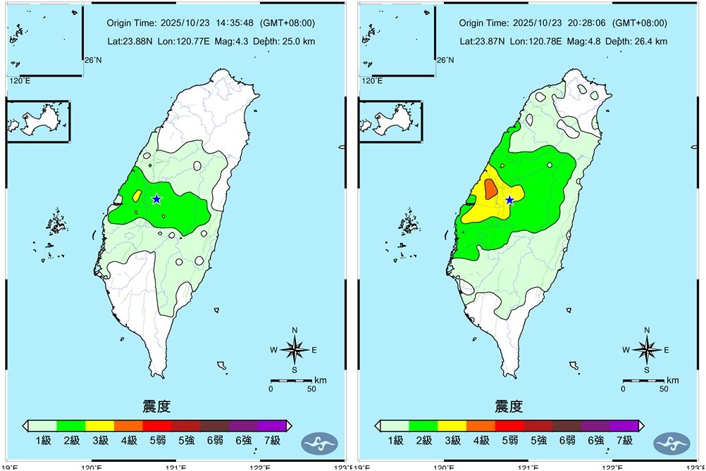 南投中寮23日一日四震,第一起發生在下午2時35分,規模4.3、深度25公里,最大震度彰化、雲林都3級搖晃。第二起發生在晚間8時28分,規模最大,有4.8,深度也僅26.4公里,最大震度依舊在彰化達到4級,中台灣都能感受到地表一陣晃動。