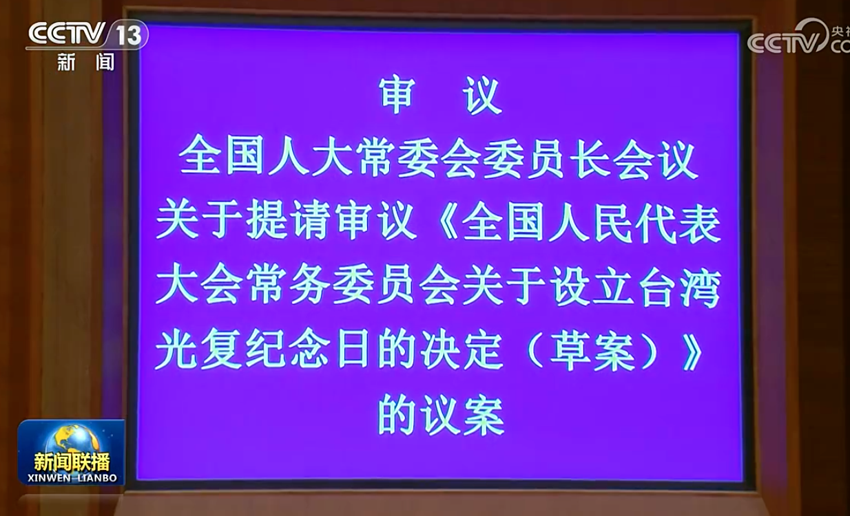 大陸官媒《新華社》稍早報導指出,十四屆全國人大常委會第十八次會議今天24日在京舉行,舉行第一次全體會議。常委會組成人員154人出席會議,出席人數符合法定人數。會議表決通過了《全國人大常委會關於設立台灣光復紀念日的決定》(草案),明確自今年起,每年10月25日設立為「台灣光復紀念日」。