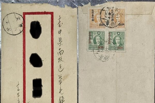 南投縣文化資產學會理事長、文物收藏家梁志忠,近日在臉書社團「草屯人」分享一張1949年(民國38年)寄出的老舊信封,收件地址寫著「台中縣南投區」,上頭還貼著4張郵票,總郵資高達8000元,引起網友熱烈討論。